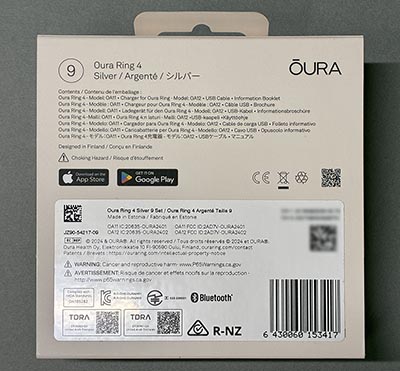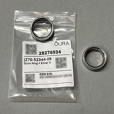 Replacement Oura Ring 4 (Silver, Size 9)Original Oura boxCharger and cableOriginal Oura Ring 4 (Silver, Size 9) (still functional, but battery life reduced to ~1–1.5 days)
