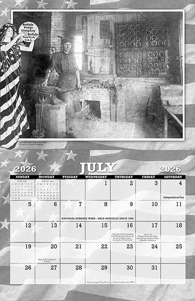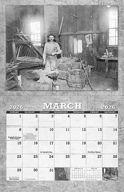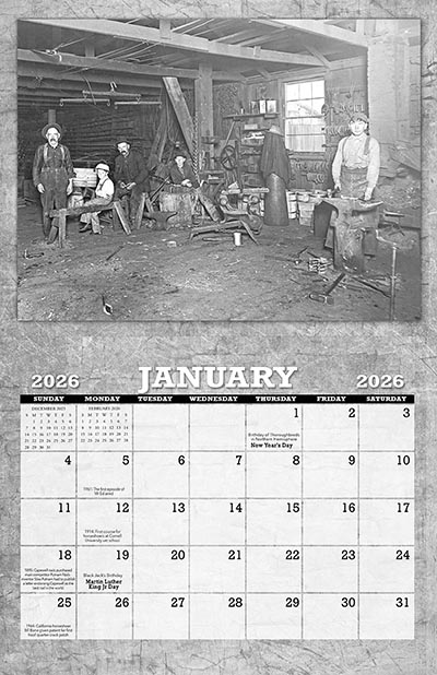 2026 Blacksmith 25th Anniversary Calendar of Vintage ImagesThese calendars are a wealth of high quality images of all things to do with blacksmithing in days of old. Features 12 big pictures of antique blacksmith shop scenes, showing lots of equipment, tools, and of course blacksmiths of the day, each one a frameable piece of history in it's own right. The unfolded dimensions are 11" x 17