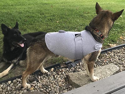 I got this in as a sample for our dog who is afraid of bugs landing on her. She is the brown dog pictured - a Malamute mix who weighs about 60 pounds and has medium thick hair coat (not fluffy at all) The tag says XL but she is not an XL dog. At any rate, it's adjusted snugly as shown. She was briefly calmer wearing it but in the heat of summer this was not going to be a feasible solution. She wore it for probably less than an hour, after which it was washed and dried. It washed and dried perfectly and not even any residual hair in the velcro!