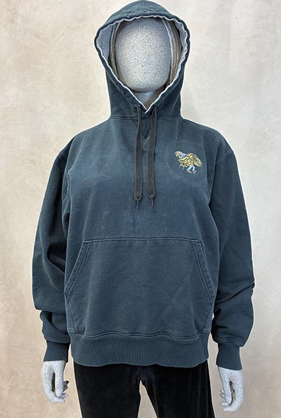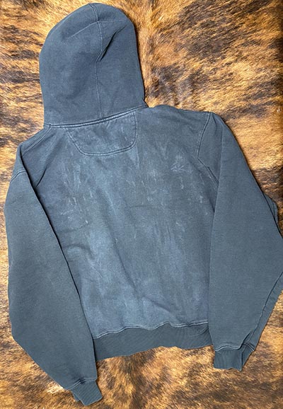 Years of wear* have given this navy hoodie a beautiful sun-faded, broken-in quality that no new garment can replicate. The grey contrast lining inside the hood adds a subtle detail that sets it apart. It's soft, substantial, and ready for the barn, the truck, or the couch.
