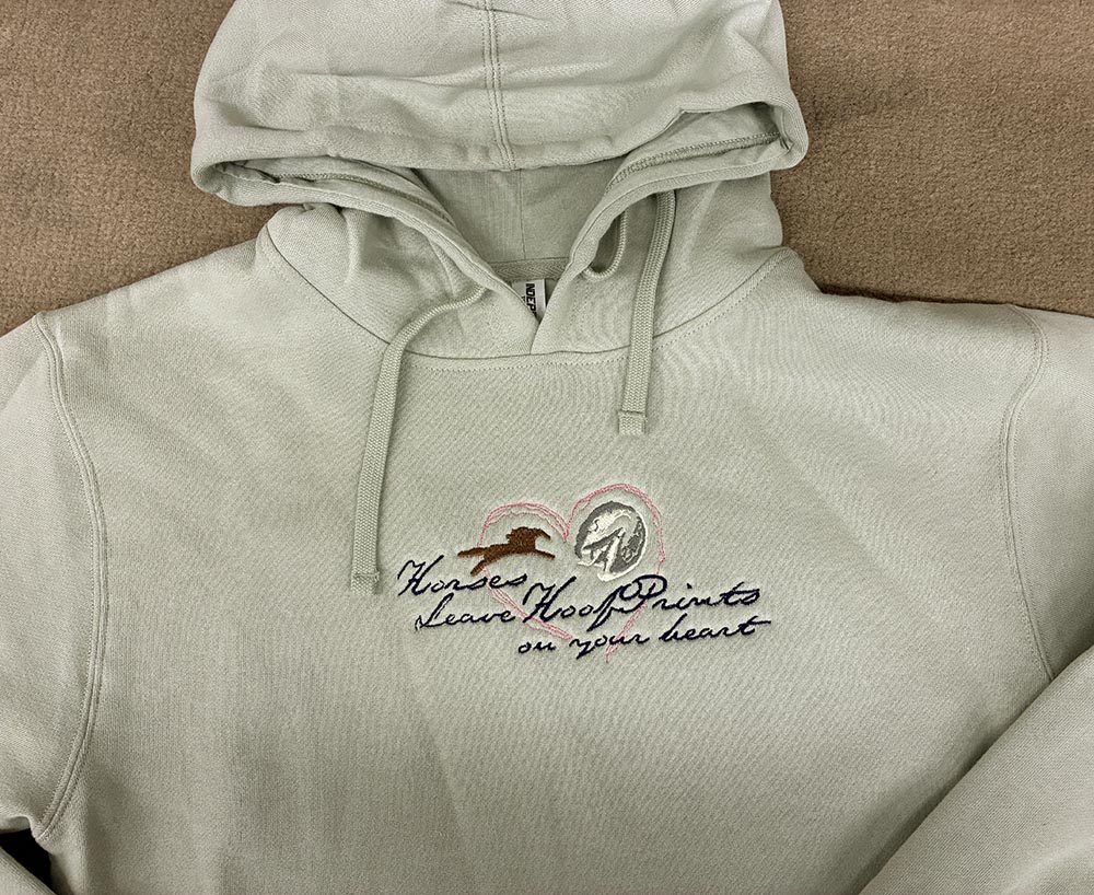 Denim blue hoodie is embroidered right here in HoofPrints warehouse with our our own art HORSES LEAVE HOOFPRINTS ON YOUR HEART. Theres a funny backstory about the hoofprint in the embroidery design that involves a fiery pony, a blabbing little boy and Play-Doh here