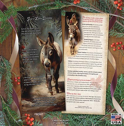 This is one of our most popular Christmas cards; it features a lovely verse by Rita S. Beer. I don't know Rita - but I'd bet that she's a horse/donkey person based on one line in this poem: "I gladly carried Mary through the chaos of the crowd." Only someone who's worked with equines would know to note how significant it is that the donkey carried Mary safely through what must have been a very scary situation. Consider what it would be like now, if we were all required to travel somewhere far away to pay our taxes in person. Considering all the grumbling that is heard around tax time - the IRS is probably pretty wise to allow us to do it by mail!