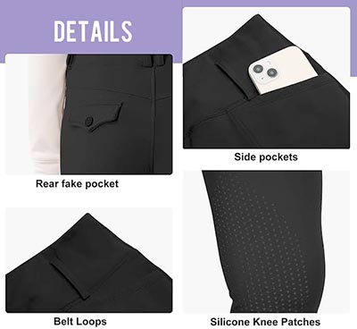Four-way stretch soft fleece fabric is durable and comfortable. These breeches are new, have been machine washed and dried but never ridden in. Have two functional front pockets, back pocket flaps are decorative.