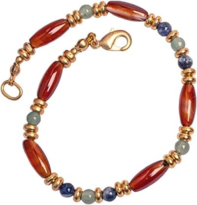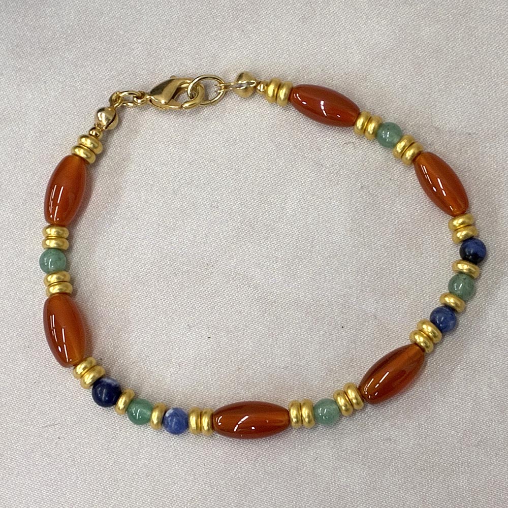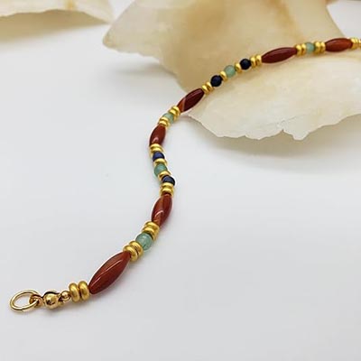 This handmade beaded bracelet is Egyptian inspired and invokes a sense of Cleopatra.Ancient Egypt, one of the richest and most advanced of the early civilizations, appeared on the stage of history around 3100 B.C. (Dynasty I). Hieroglyphic scripts and tomb decorations document the Egyptians' belief in the after-life, their mythology and deities. Jewelry was often worn as protective talismans.High-quality 18K gold plated parts along with genuine gemstones and beads.Made in the USAThe bracelet is 7.5 inches long with a lobster claw closure.