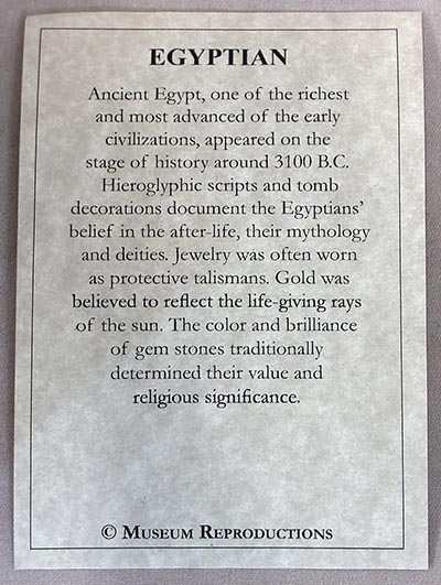Comes gift-boxed with parchment card explaining the history of the gem stones and Egyptian design