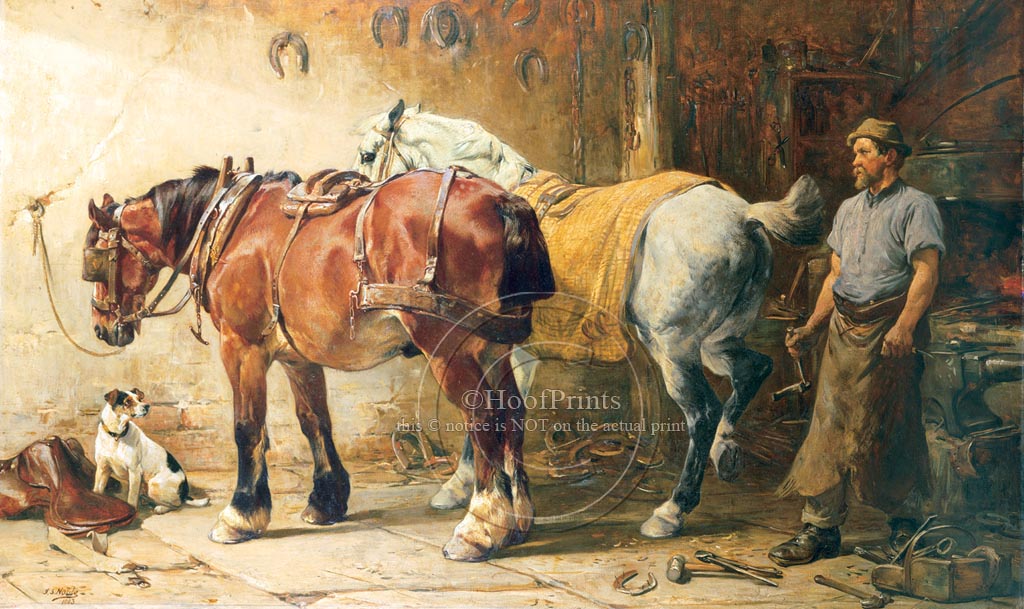 The picture has so much energy, so much going on. The tension between the farrier and horse is obvious, and on further study one notices the expression on the little dog; he knows something is about to happen. In the middle of all this action, the bay horse appears to be sleeping! The contrast in structure of the two horses; a fine boned hot-blood and a heavy cold-blood is apparent. John Sargent Noble was a painter who truly knew his subject.
