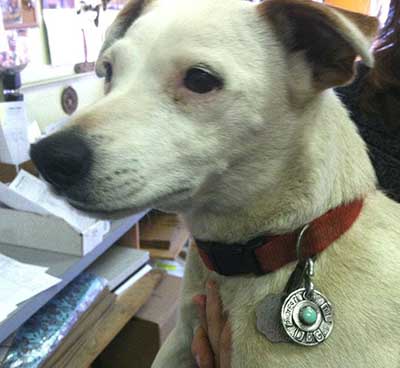 Protect This Dog Pewter MedallionsHand cast in USA lead-free pewter by Sweet Bird Studio. Turquoise resin bead accent. Comes with S-hook to attach to collar. Large is 1" wide, Small is 3/4" wide.
