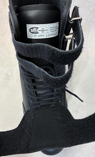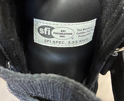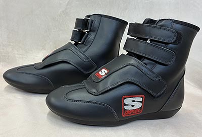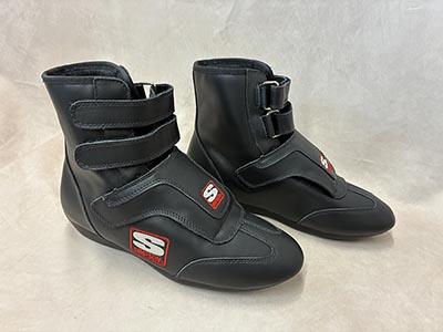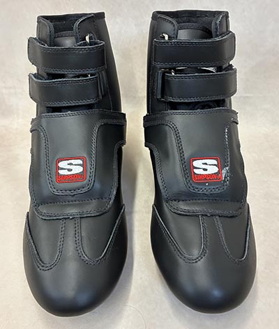 A new take on our ever-popular Sprint shoe, The Stealth sports the Simpson S-Logo and a modified lace guard for those who prefer a futuristic look.Features:SFI 3.3/5 certified and includes SFI tagImproved softer leatherHigh-top design with Simpson's easy to clean leather upperSimpson's exclusive EnviroGuard lace cover hinges at the tongue base with full length speedfit closures on each sideFleece Nomex®® lined with flat seams and athletic insertSuper smooth leather toe, lace, and heel guard reinforcementsType R polyurethane sole with posi-grip patternSeven hole lace-up with dual speedfit closure and lace guardAdjustable wrap-around ankle supportSloping achilles heel design
