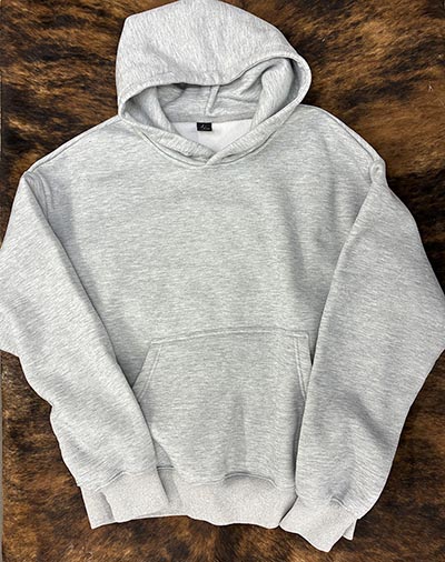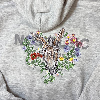 This super heavy hoodie is almost 9 oz fabric weight, quite a bit thicker than our other sweatshirts. I got it in as a sample; it had an awkward slogan screenprinted on the back in light grey. Rather than let a perfectly good heavyweight hoodie go to waste, I covered the nonsense with Lesley Bruce's spunky donkey and his wreath of wildflowers.