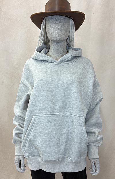 Tag says it's 100% polyester but it is super soft and snuggly, smooth outside and plush inside. Measures 27" wide at the armpits and 28" tall shoulder to hem. Sleeves are 23" armpit to cuff. This garment has been washed and dried (but not worn) so no shrinkage expected and there was zero pilling.