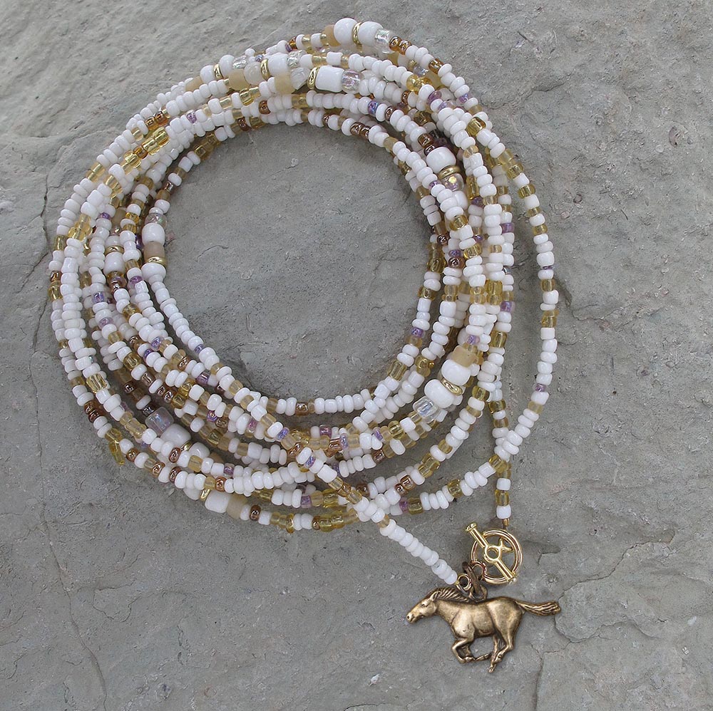 Brass charm is about 1" wide. Closes with a toggle clasp. Hand strung right here at HoofPrints in between packing orders.